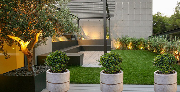 Προκατασκευασμένη κυκλική ζαρντινιέρα εμφανούς σκυροδέματος με μαρμάρινες ψηφίδες και στοιχεία INOX.